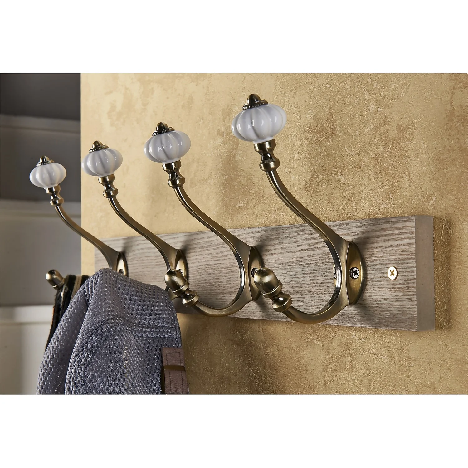 A rustic coat rail featuring 4 antique style double hooks with decorative ceramic tops.