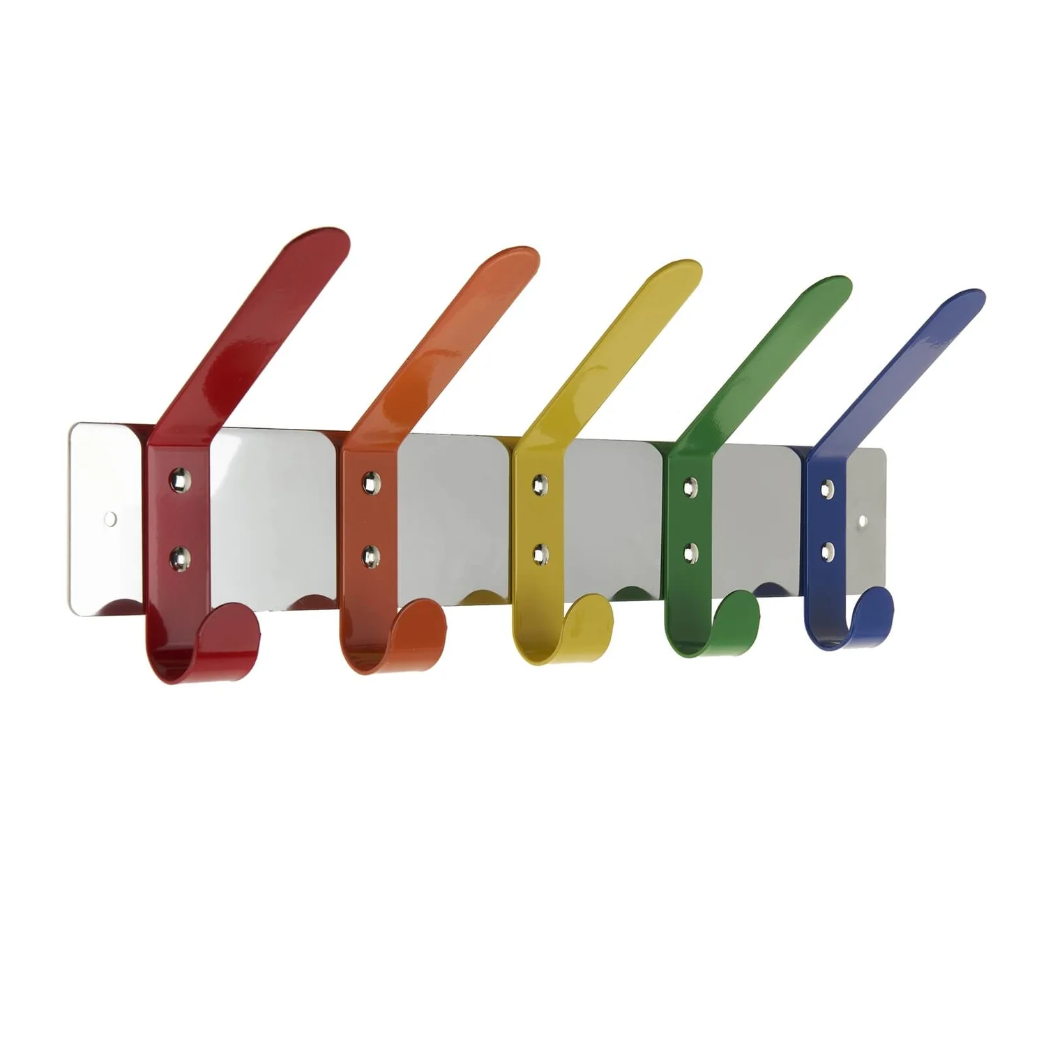 Colourful retro style coat hanger. Features 5 painted metal coat hooks.