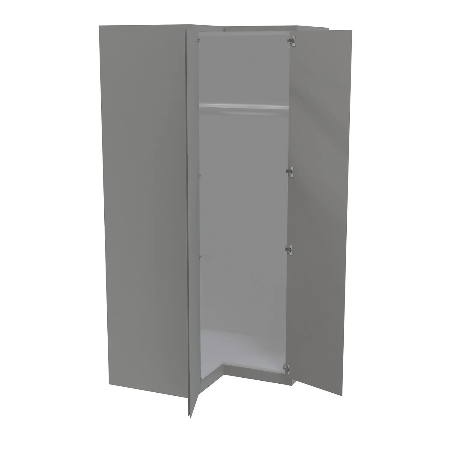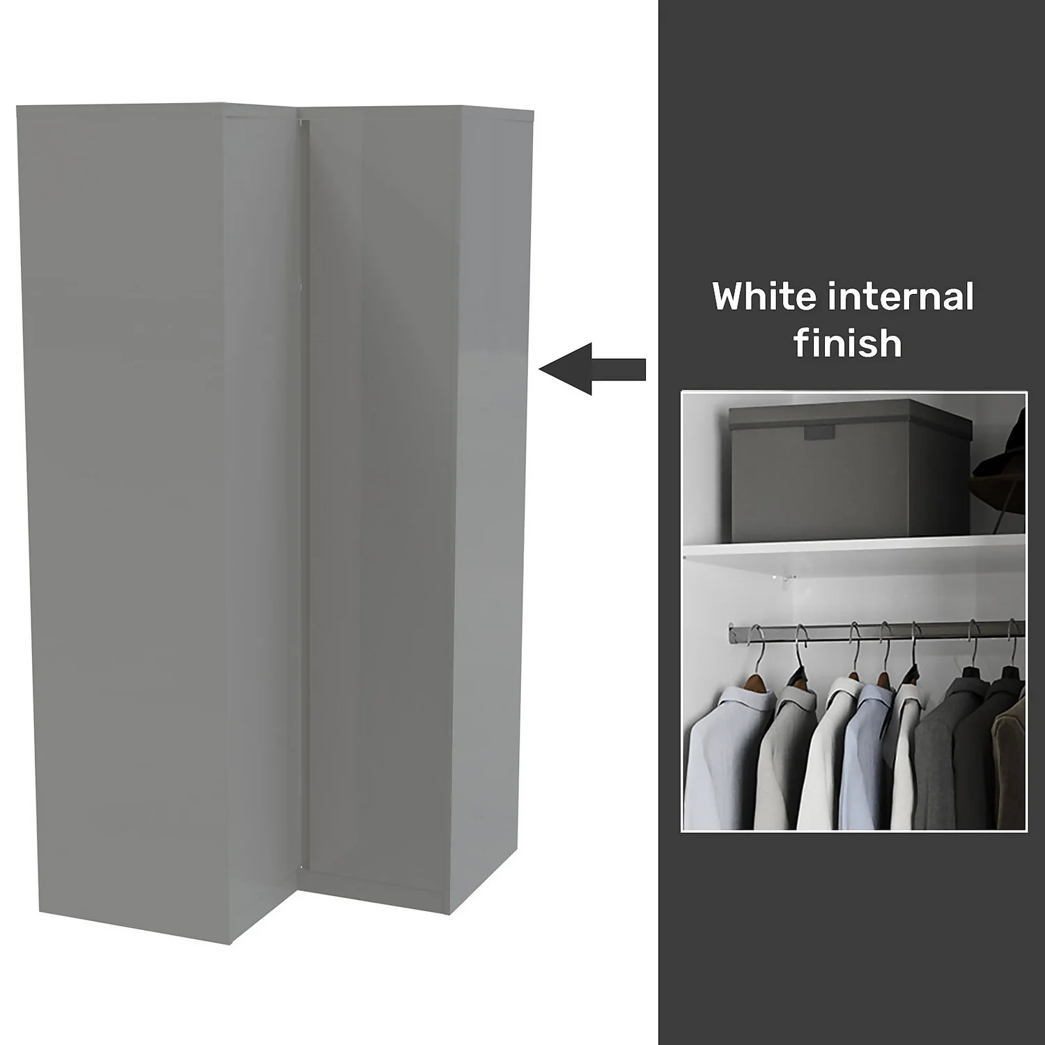 This corner wardrobe (1 x double unit and corner conversion) features a white internal carcass and beautiful luxe gloss grey handleless doors. The wardrobe features premium soft close clip-on Blum hinges, five shelves and a hanging rail. You can customise your wardrobe with our additional internal storage options (available separately) including internal drawers, shelves, dividing shelves and extra hanging rails.