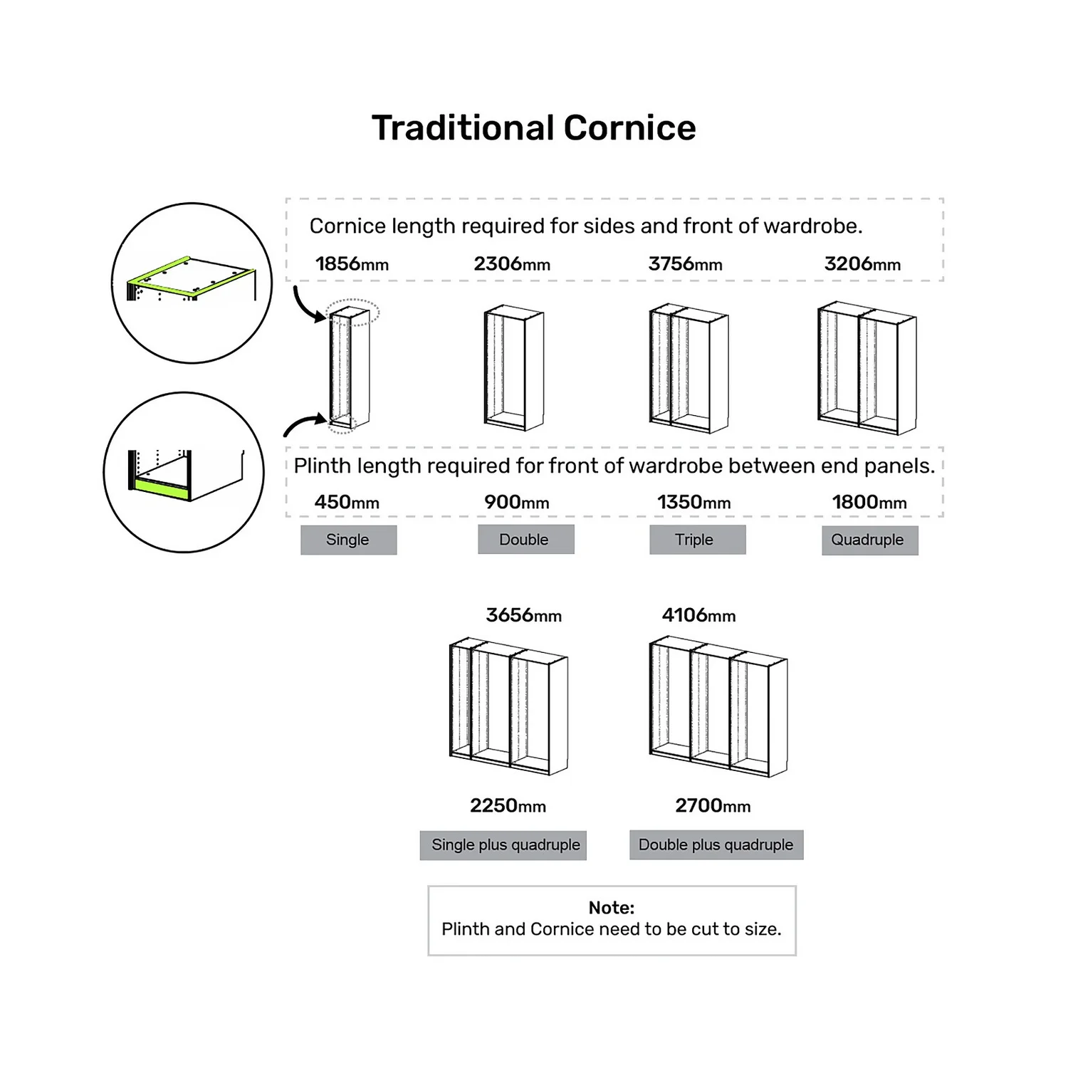 Take your wardrobes to the next level by creating that fitted bedroom look with our House Beautiful coordinating traditional plinth. This provides the finishing touch to tie in with your chosen door finish and is perfect when partnered with the coordinating cornice and end panels (available separately) to complete the look.