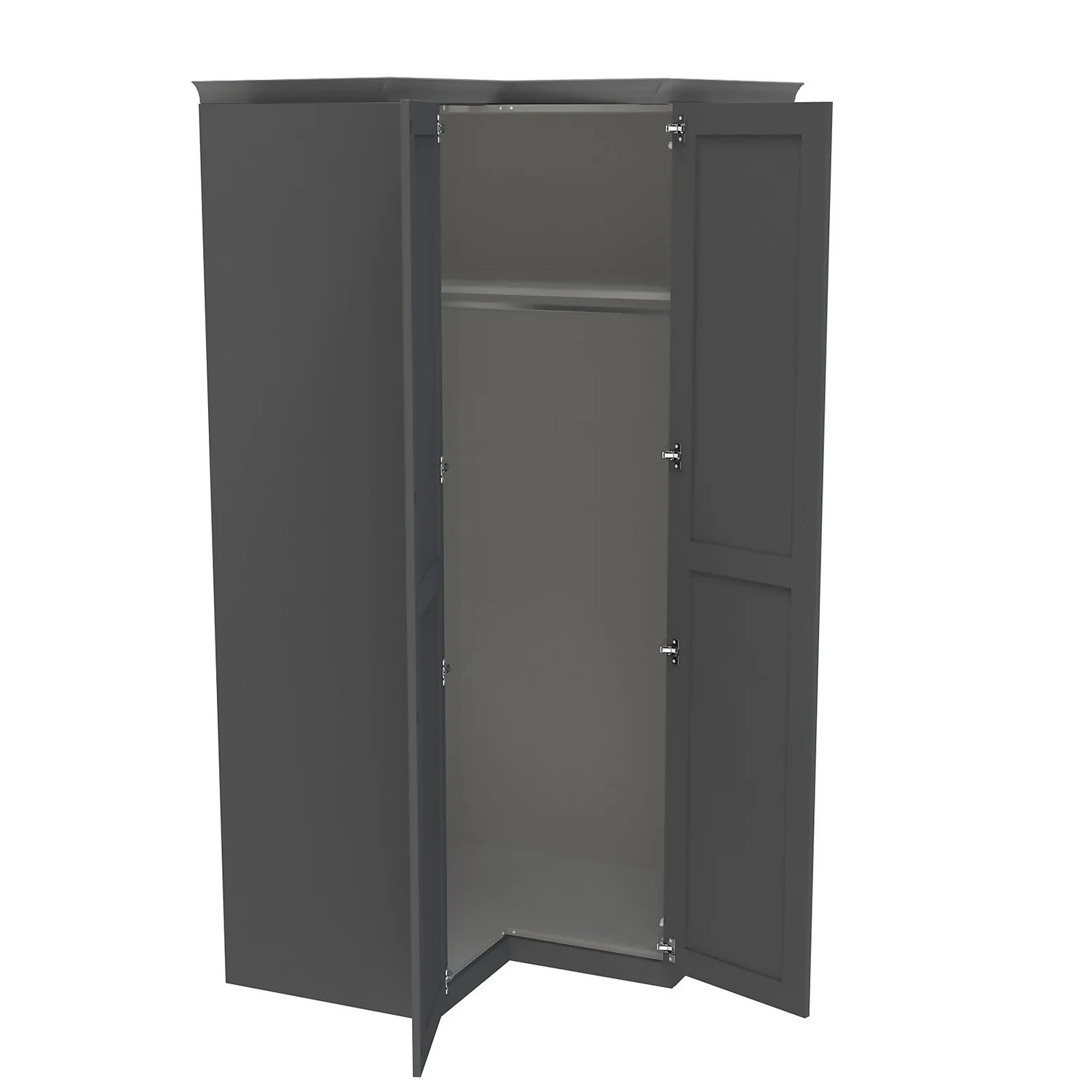 The House Beautiful range is exclusive to Homebase and offers a selection of different finishes and storage configurations to suit your needs. With a range of carcass colours and contrasting door designs, you can select the look to fit your bedroom aesthetic. The House Beautiful range now includes the fully fitted look with this combination pack which includes the wardrobe, end panels, plinth and cornice, meaning you can complete your bedroom with a luxury look. Coordinating chests of drawers are also available separately. This corner wardrobe (1 x double unit and corner conversion) features a grey internal carcass and includes end panels, plinth and matching cornice all in a finish to match the beautiful luxe matt carbon grey shaker doors. The wardrobe features premium soft close clip-on Blum hinges, five shelves and a hanging rail. You can customise your wardrobe with our additional internal storage options (available separately) including internal drawers, shelves, dividing shelves and extra hanging rails. Choose your handles from our range of both traditional and modern to suit your desired look.