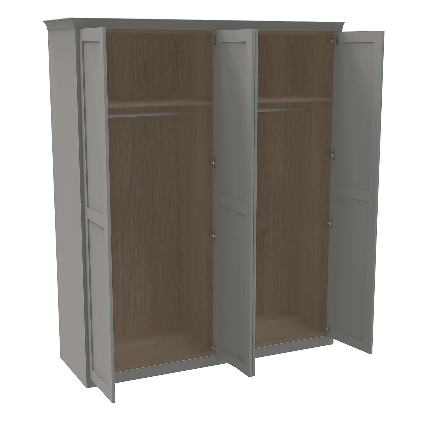 - A fitted look is achieved by using clad on panels, plinth and cornice which are all included with this wardrobe. All the elements that clad the internal oak carcass (clad on panels, plinth and cornice) are a perfect match to the matt grey shaker door