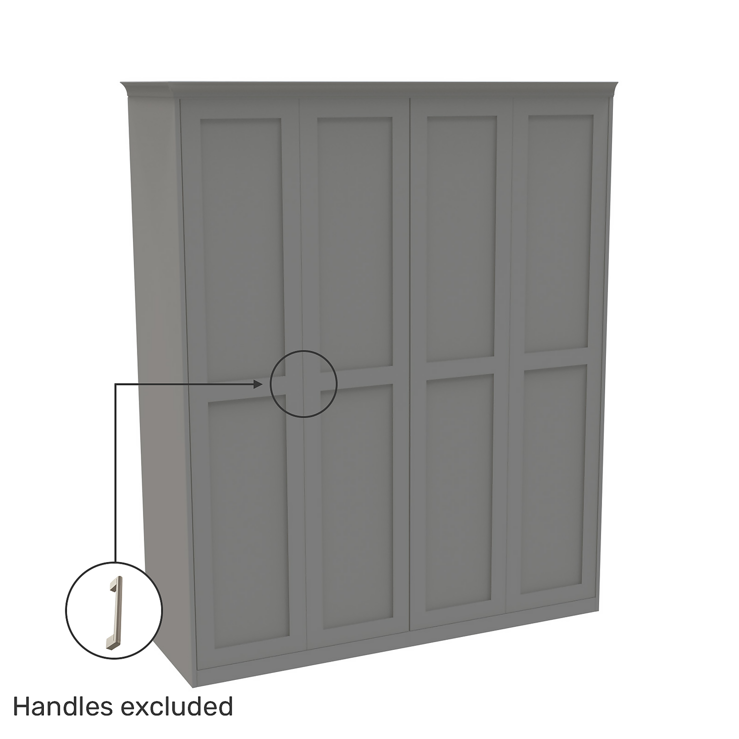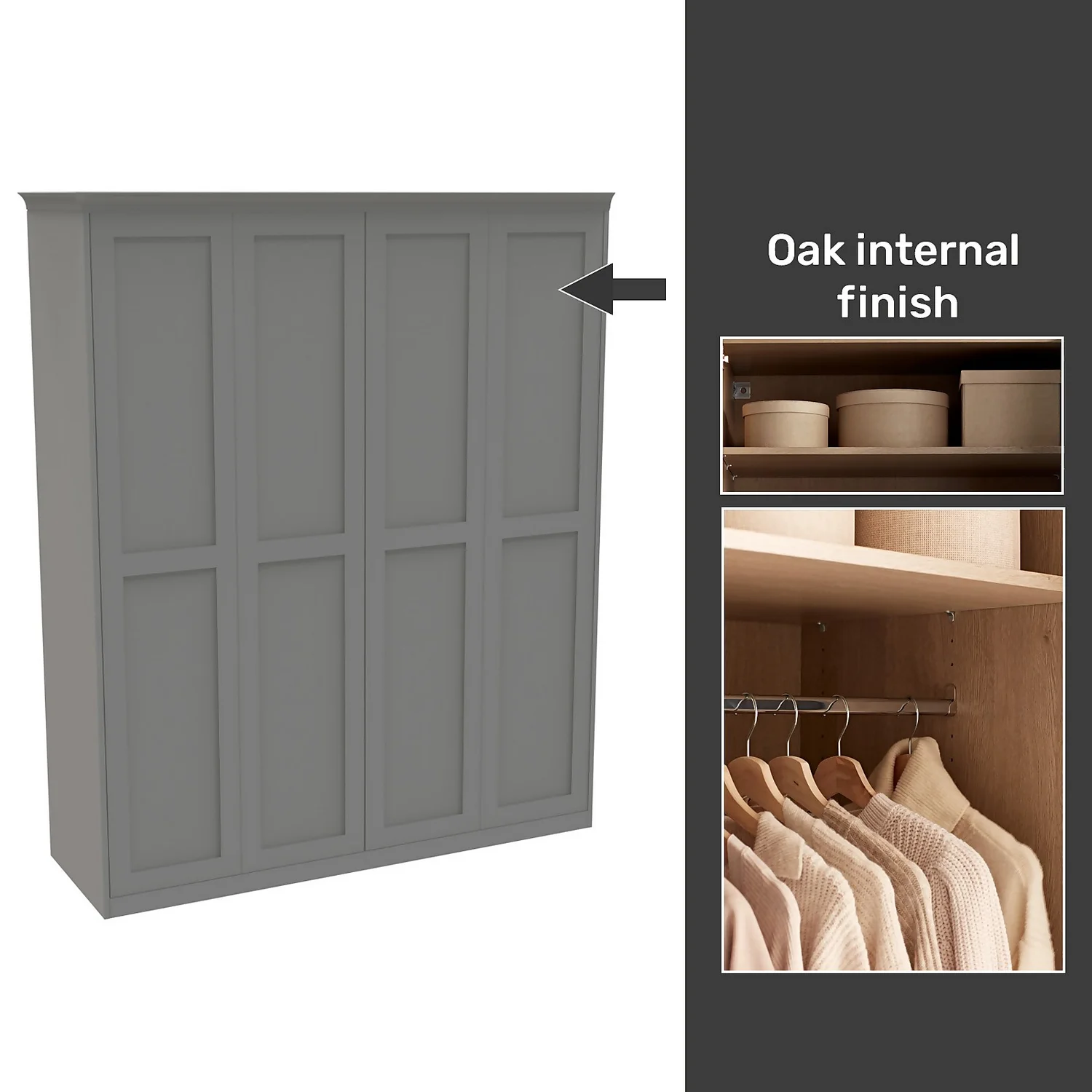This four door wardrobe (2 x double units) features an oak effect internal carcass and includes end panels, plinth and matching cornice all in a finish to match the beautiful luxe matt grey shaker doors. The wardrobe features premium soft close clip-on Blum hinges, two shelves and two hanging rails. You can customise your wardrobe with our additional internal storage options (available separately) including internal drawers, shelves, dividing shelves and extra hanging rails. Choose your handles from our range of both traditional and modern to suit your desired look.