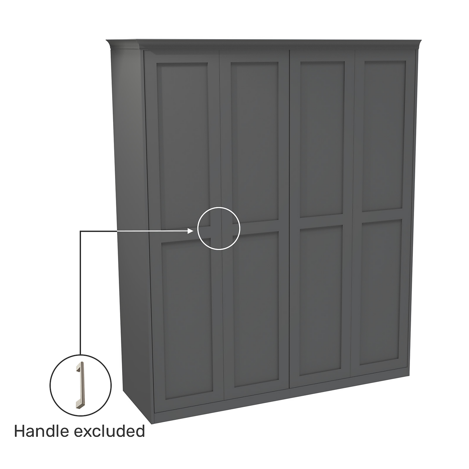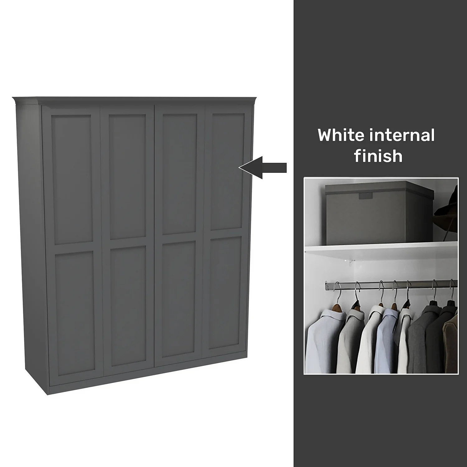 This four door wardrobe (2 x double units) features a white internal carcass and includes end panels, plinth and matching cornice all in a finish to match the beautiful luxe matt carbon grey shaker doors. The wardrobe features premium soft close clip-on Blum hinges, two shelves and two hanging rails. You can customise your wardrobe with our additional internal storage options (available separately) including internal drawers, shelves, dividing shelves and extra hanging rails. Choose your handles from our range of both traditional and modern to suit your desired look.