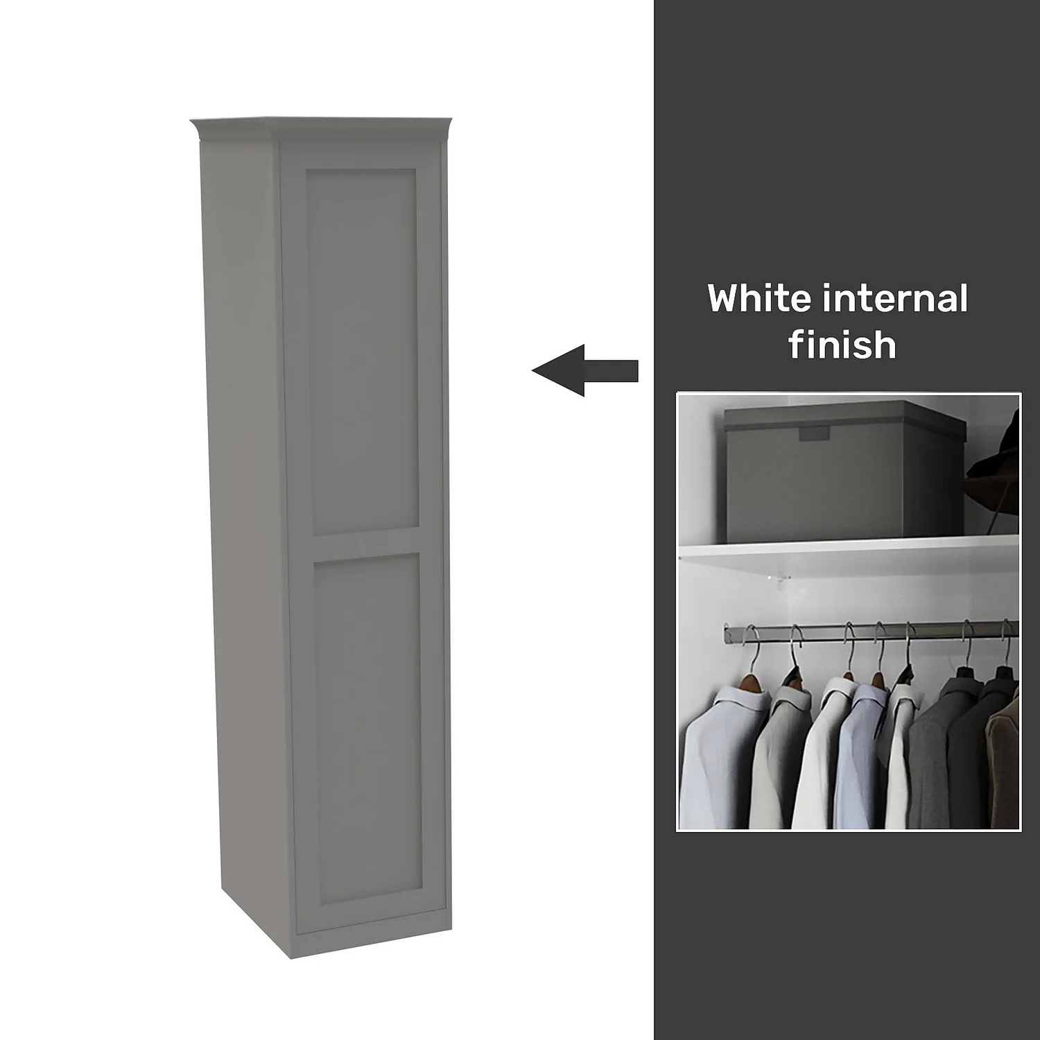 This single wardrobe features a white internal carcass which includes end panels, plinth and matching cornice all in a finish to match the beautiful luxe matt grey shaker door. The wardrobe features premium soft close Blum hinges, a shelf and a hanging rail. You can customise your wardrobe with our additional internal storage options (available separately) including internal drawers, shelves, dividing shelves and extra hanging rails. Choose your handles from our range of both traditional and modern to suit your desired look.