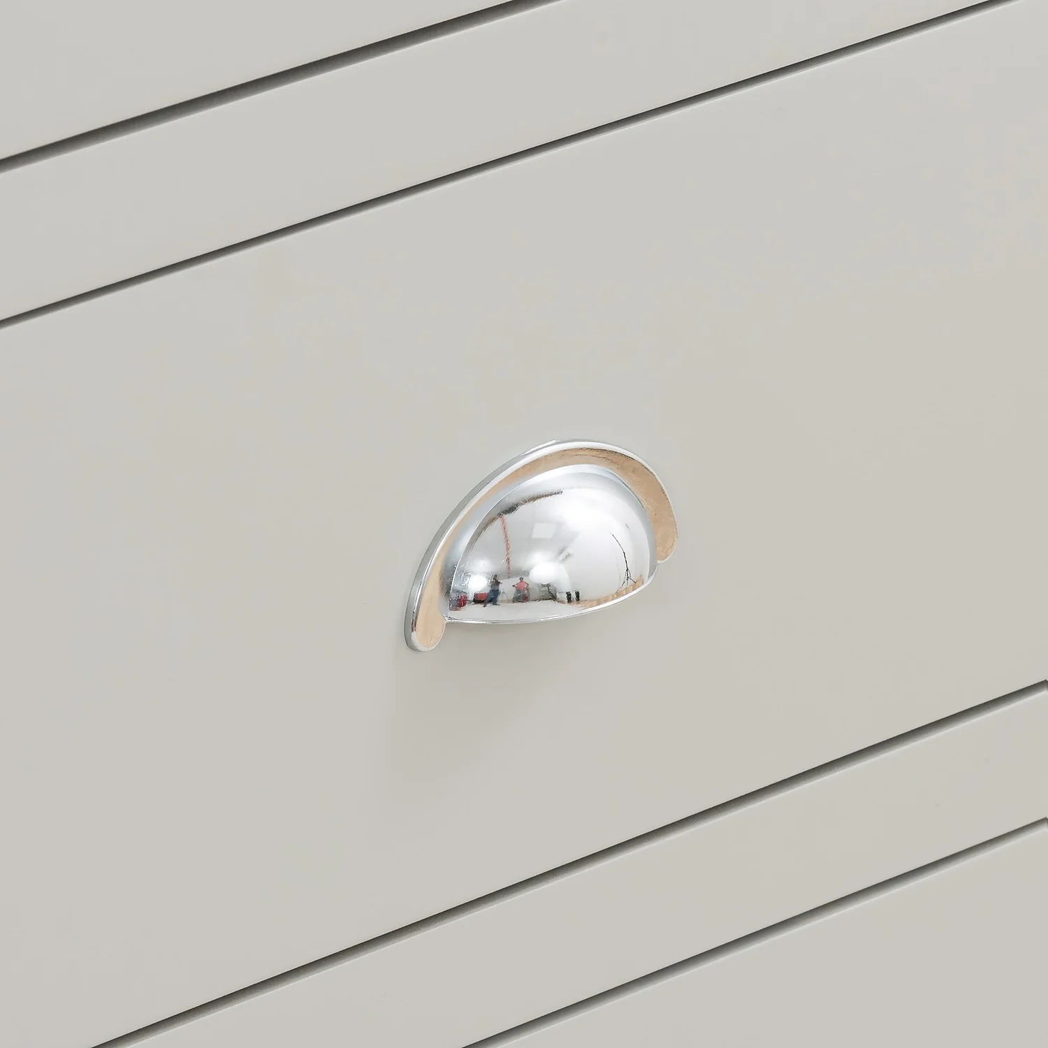 We’ve worked hard to make Norbury our most family-friendly range yet. We’ve softened all the edges, even the legs, so there are no sharp corners here. This compact collection has a small footprint, but its clever design doesn’t compromise on storage space. Meet our oak Norbury 5 drawer chest. With its classic oak top and cup handles, it has a charming timeless design but with a modern painted grey finish. Stow away your foldable clothes in the 3 wide drawers then use the top 2 drawers for your socks and smalls. The top surface also comes in handy for showcasing some of your favourite trinkets. This chest of drawers is a bedroom must-have.