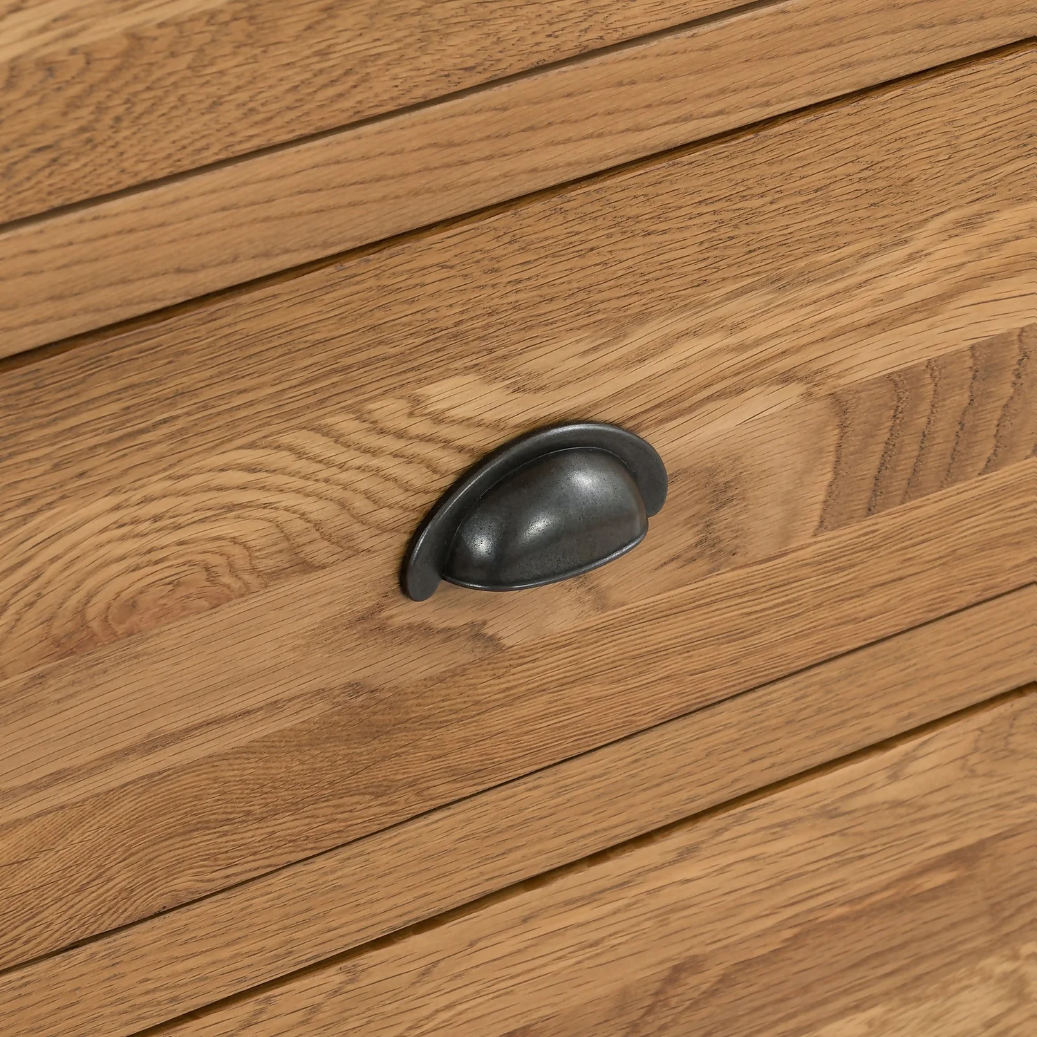 We’ve worked hard to make Norbury our most family-friendly range yet. We’ve softened all the edges, even the legs, so there are no sharp corners here. This compact collection has a small footprint, but its clever design doesn’t compromise on storage space. Meet our oak Norbury 5 drawer chest. With its classic oak finish and cup handles, it has a charming timeless design. Stow away your foldable clothes in the 3 wide drawers then use the top 2 drawers for your socks and smalls. The top surface also comes in handy for showcasing some of your favourite trinkets. This chest of drawers is a bedroom must-have.