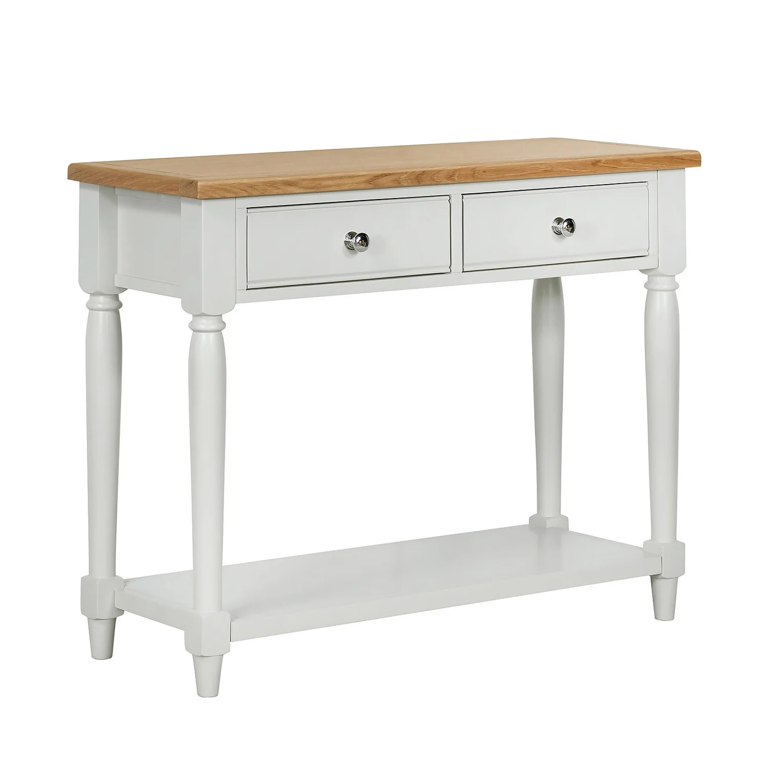 Traditional style at its best. The hand-painted Westcott exudes timeless country chic with its two-tone finish, panelled drawer fronts and elegant hand-crafted turned legs. The fresh ivory tone gives this console table a modern lift. A versatile number, it looks right at home in the hallway, lounge or bedroom. There are 2 drawers to stash away mail and correspondence, whilst the bottom shelf can house a storage basket and a few books. The top surface is the perfect home for a pretty lamp or trinket bowl, and somewhere to pop your house keys on too. It makes a great stand-alone piece or team it with other items in the Westcott collection for a cohesive look.